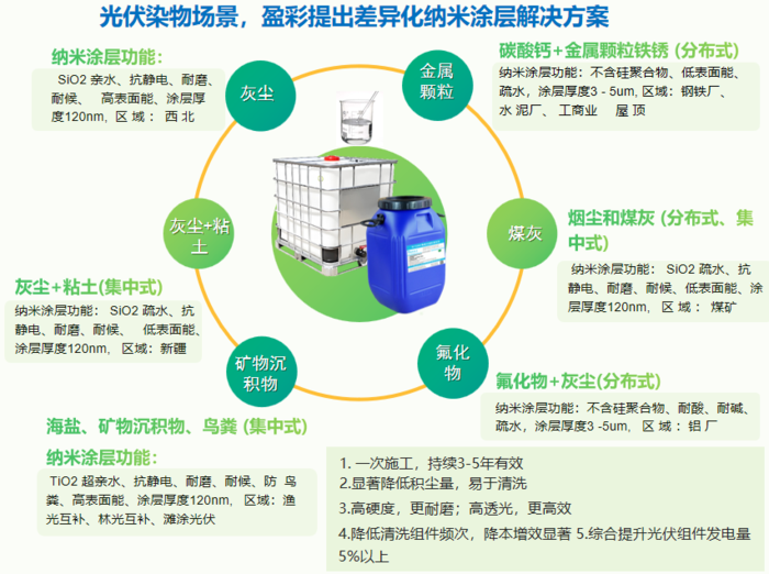 一、灰尘污染(集中式光伏电站) 亲水型纳米涂层:采用SiO₂纳米中空分形技术,形成50-100nm微米级凹凸结构,水接触角<10°,遇水自动清洁,减少静电吸附,透光率提升3%-5%。适用于多雨地区,如西北荒漠13。 疏水型纳米涂层:针对沙尘暴地区(如新疆),涂层疏水角度>90°,抗静电性能优异,灰尘遇风或雨水可自动清除,发电量增益达5%以上。 二、复合污染(工业区/沿海) 耐腐蚀涂层:针对冶金、化工等高污染环境,涂层耐酸碱性(如氢氟酸、铁锈),耐磨性达传统涂层25倍以上(25000次测试),延长组件寿命至5-8年。 防盐雾涂层:沿海地区专用,抵抗高盐雾腐蚀,结合疏水自清洁功能,减少人工清洗频率60%以上。 三、生物污染(渔光互补/林光互补) 防鸟粪涂层:TiO₂基有机-无机杂化涂层,疏水角度>110°,鸟粪干燥后自动收缩脱落,降低热斑效应,发电量提升3%-5%16。 四、特殊污染(矿区/交通密集区) 防煤灰/水泥灰涂层:低表面能设计,抑制粉尘附着,适用于采矿区周边电站。 抗油污涂层:针对交通排放污染物,疏油疏水特性显著,污渍吸附率降低80%。 技术核心优势 自清洁性能:亲水/疏水智能切换,雨水或风力即可实现清洁,人工清洗频率减少90%。 增透效果:反射率≤2.5%,透光率提升2%-4%,综合发电效率增益3%-8%。 长效防护:纯无机成分,耐候性优异,非西北地区使用寿命达5-8年。 五、光伏染物场景,盈彩提出差异化纳米涂层解决方案